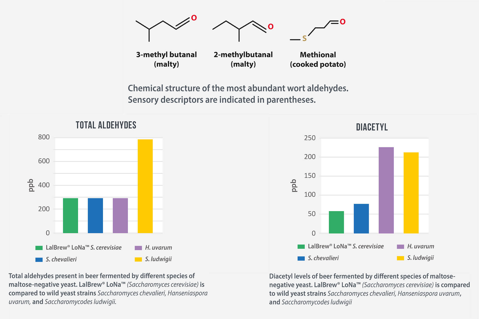 Lallemand Brewing Graphic Demonstrating Total Aldehydes & Diacetyl in Beer Fermented by Different Yeast Strains