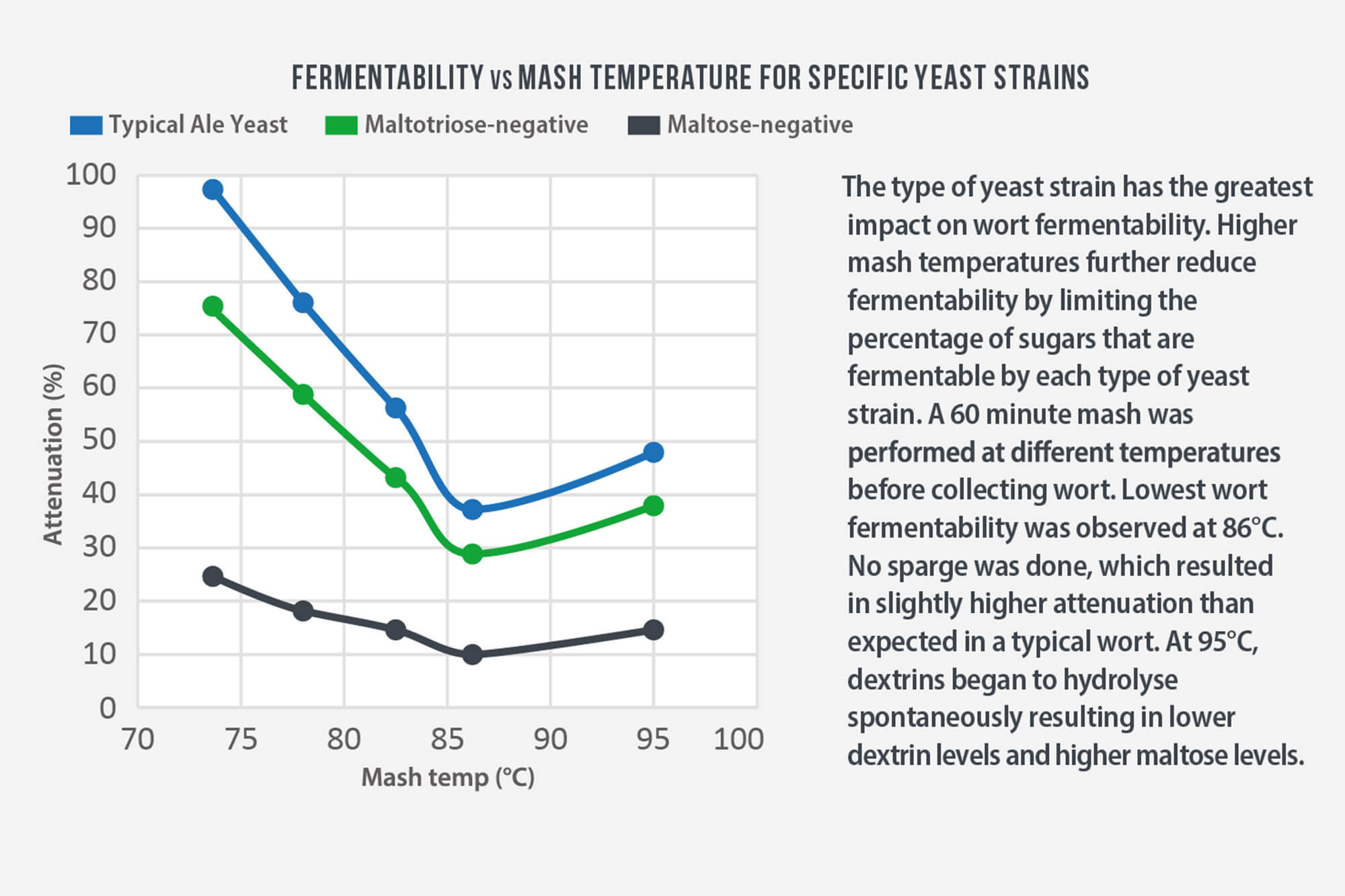 Lallemand Brewing Graphic Demonstrating the Impact of Yeast Strains on Wort Fermentability in Relation to Temperature