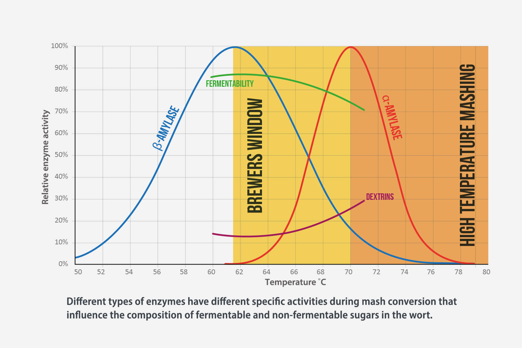 Lallemand Brewing graphic showing the Activities of Different Enzymes During Mash Conversion which influence the composition of fermentable & non-fermentable sugars in the wort.