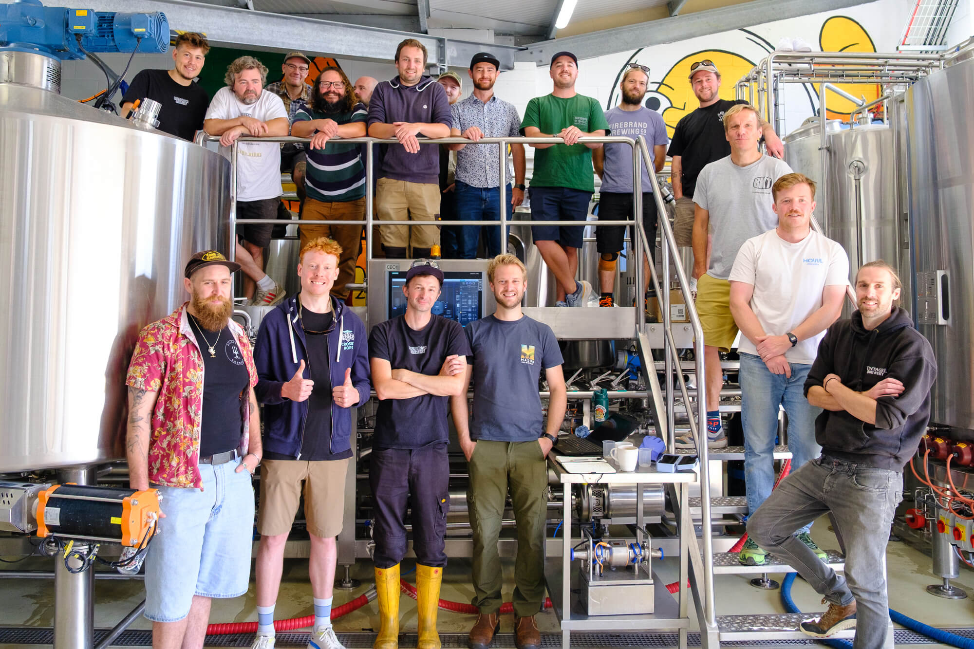 Cornish independent breweries assemble for the Bluntrock x Crosby Hops 'Big Friendly Comet' collab at Blunrock Brewery in July 2025. L-R: Braslou Biére, Driftwood Spares Brewery, Cold Frame, Pipeline Brewing Co., Firebrand Brewing Co, BrewKegTap, Howl Brewery, Tintagel Brewery, Mason Brewing Co. & Atlantic Brewery.