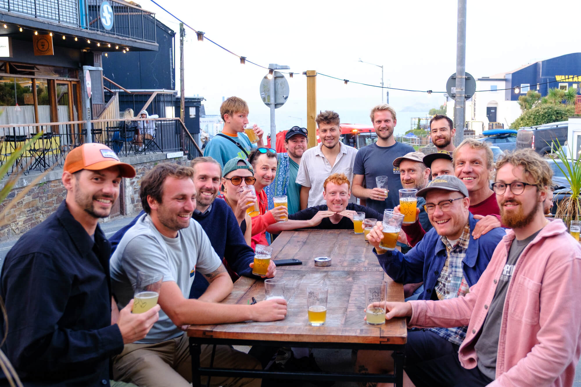 Pints at the Pagan Arms with the Cornish independent brewers for the Bluntrock x Crosby Hops 'Big Friendly Comet' collab. L-R: Bluntrock Brewery, ColdFrame, Tintagel Brewery, Lallemand Brewing, Mason Brewing Co., Atlantic Brewing Co., BrewKegTap, Loughran Brewers Select and Pipeline Brewing Co.