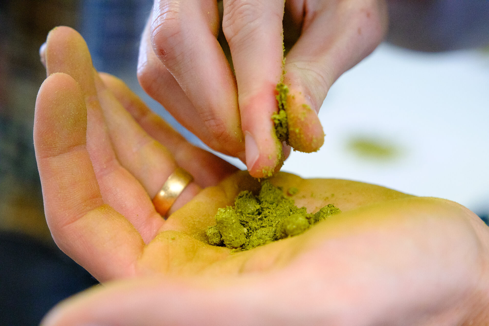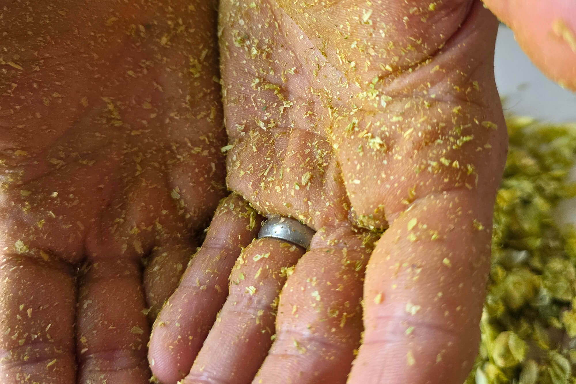 Hands full of hop oil from the Indie Hops Strata selection at Indie Hops HQ in Portland, Oregon.