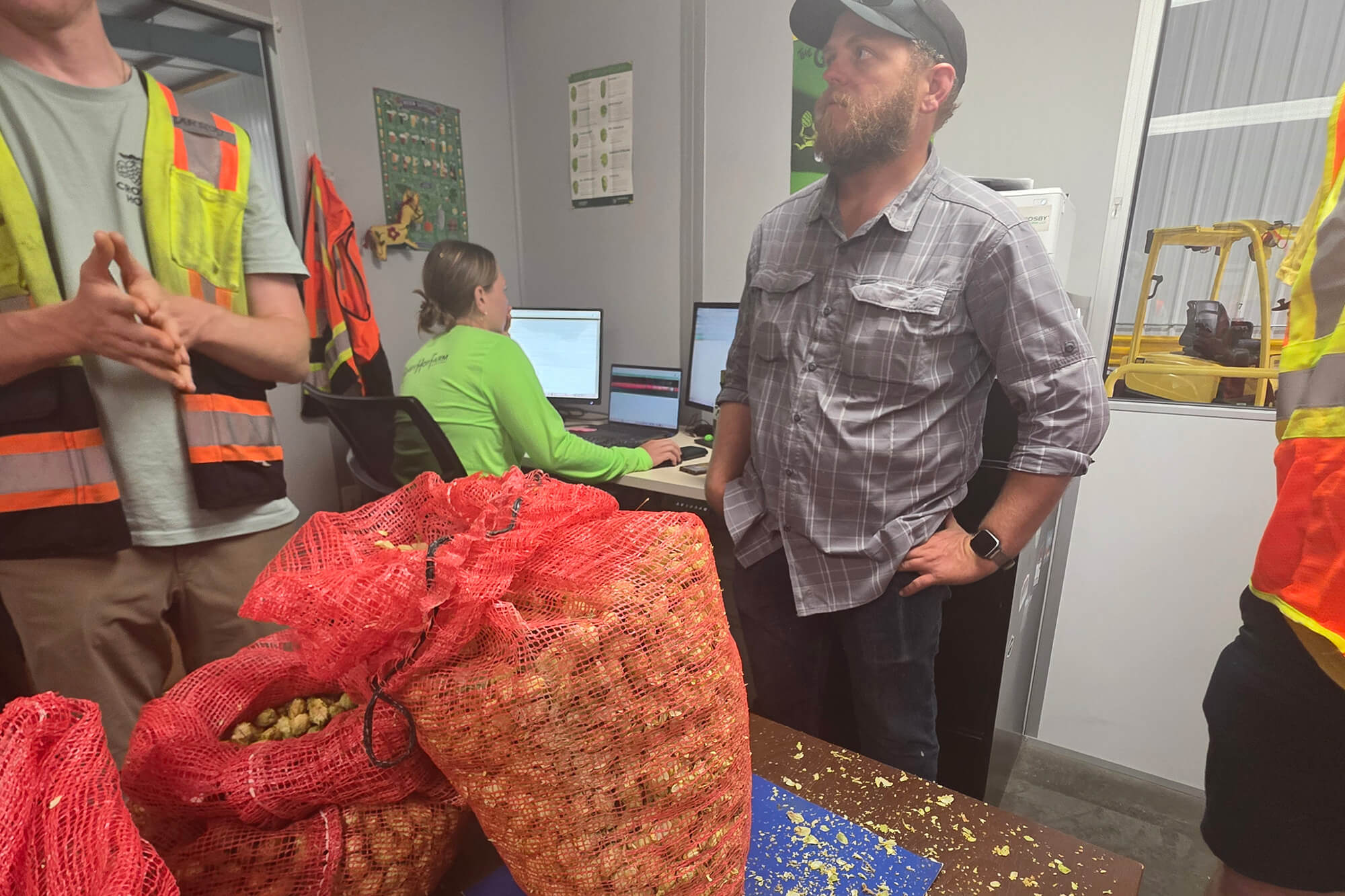 The gang at the Crosby Hops processing facility in Woodburn, Oregon. L-R: George Parker-Collins (Bluntrock), Dale Deakin (Loughran Brewers Select), Nolan Russell (Crosby Hops), Rob Hamilton (Loughran Brewers Select) and Jay Krause (Cloudwater).