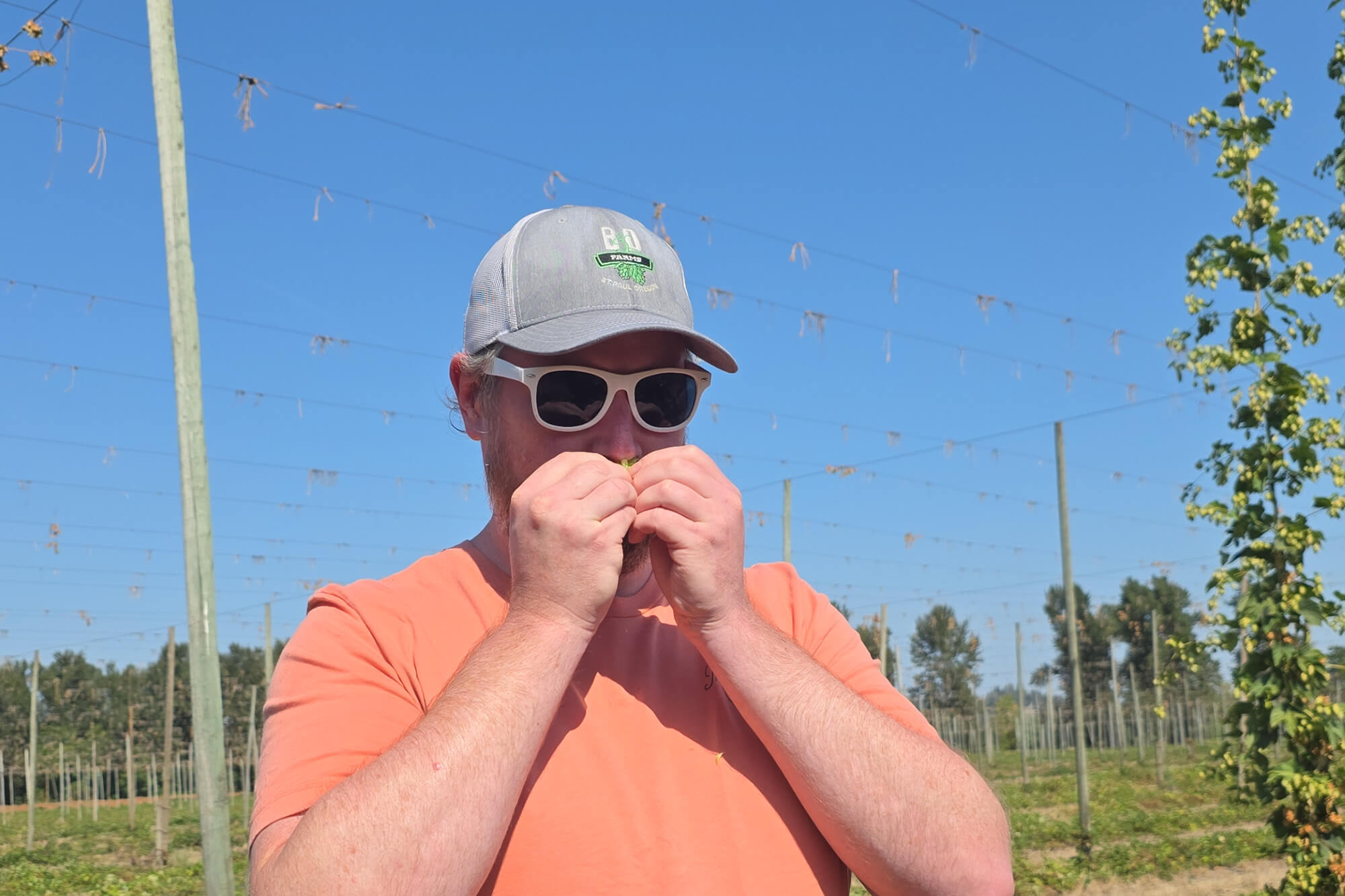 Rob Hamilton of Loughran Brewers Select sampling some Indie Hops experimental varieties in the Goschie Farms Hop Fields.