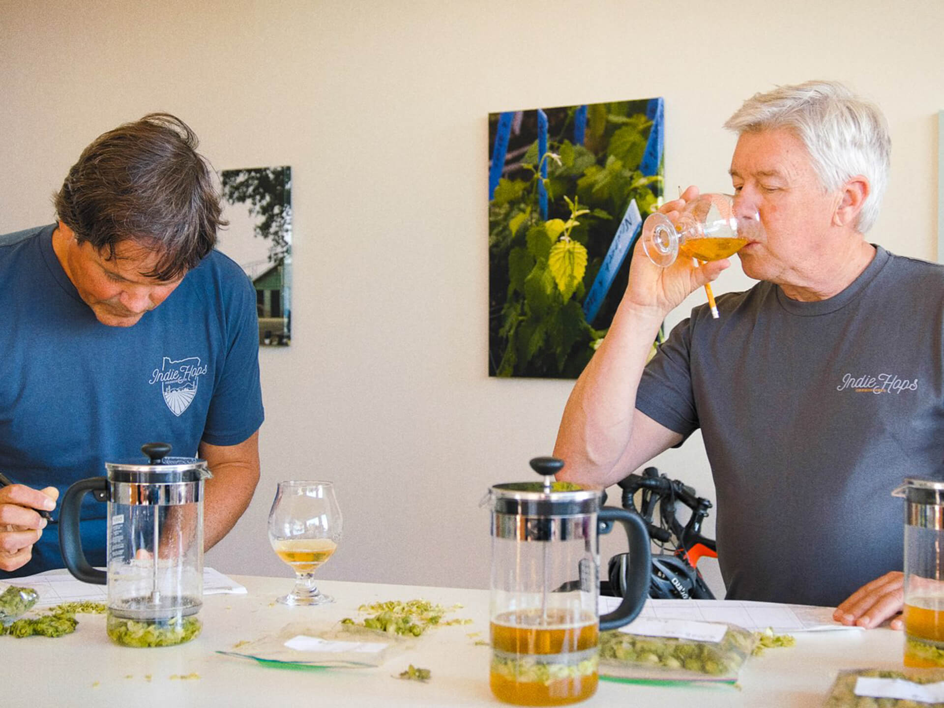 Each fall, you’ll find Jim along with Matt Sage — former brewer turned employee here at Indie Hops — rubbing and sniffing various piles of experimental hops. They give each other time to evaluate different genotypes and take copious notes. One of these new varieties could be interesting enough to advance to the next stage of our hop development program—The Indie Hops Flavor Project. “We evaluate about 150 new genotypes every year. So we have to stay well abreast of the marketplace from a hop standpoint, hop flavors that are out there, in order to really know if something is unique,” states Jim.