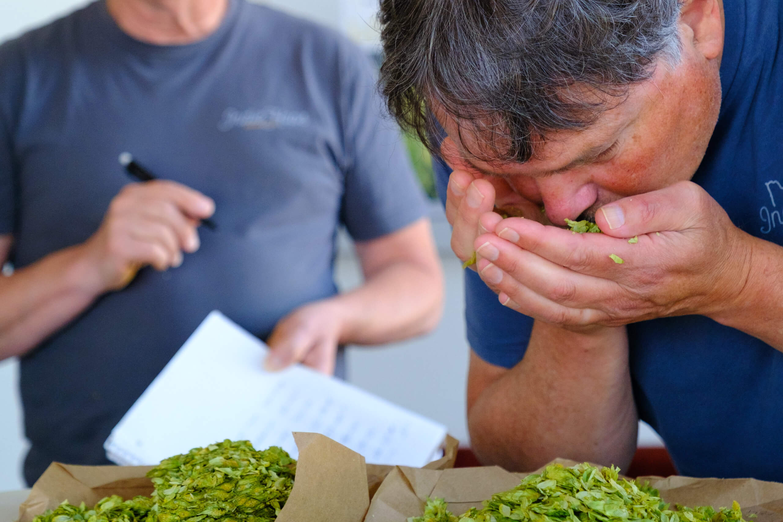 Jim Solberg conducting sensory analysis on Indie Hops Audacia® during the 2024 Oregon hop harvest