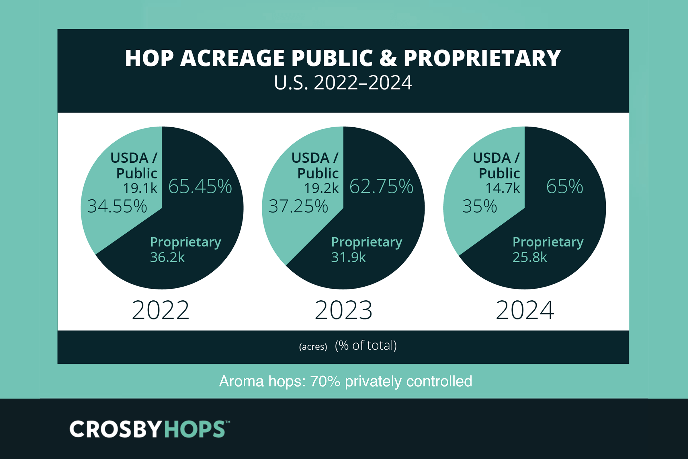 Today, 65% of the total U.S. hop market is proprietary, while only 35% remains public. This disparity is even greater in the aroma hop market, where 70% of acreage is privately controlled.