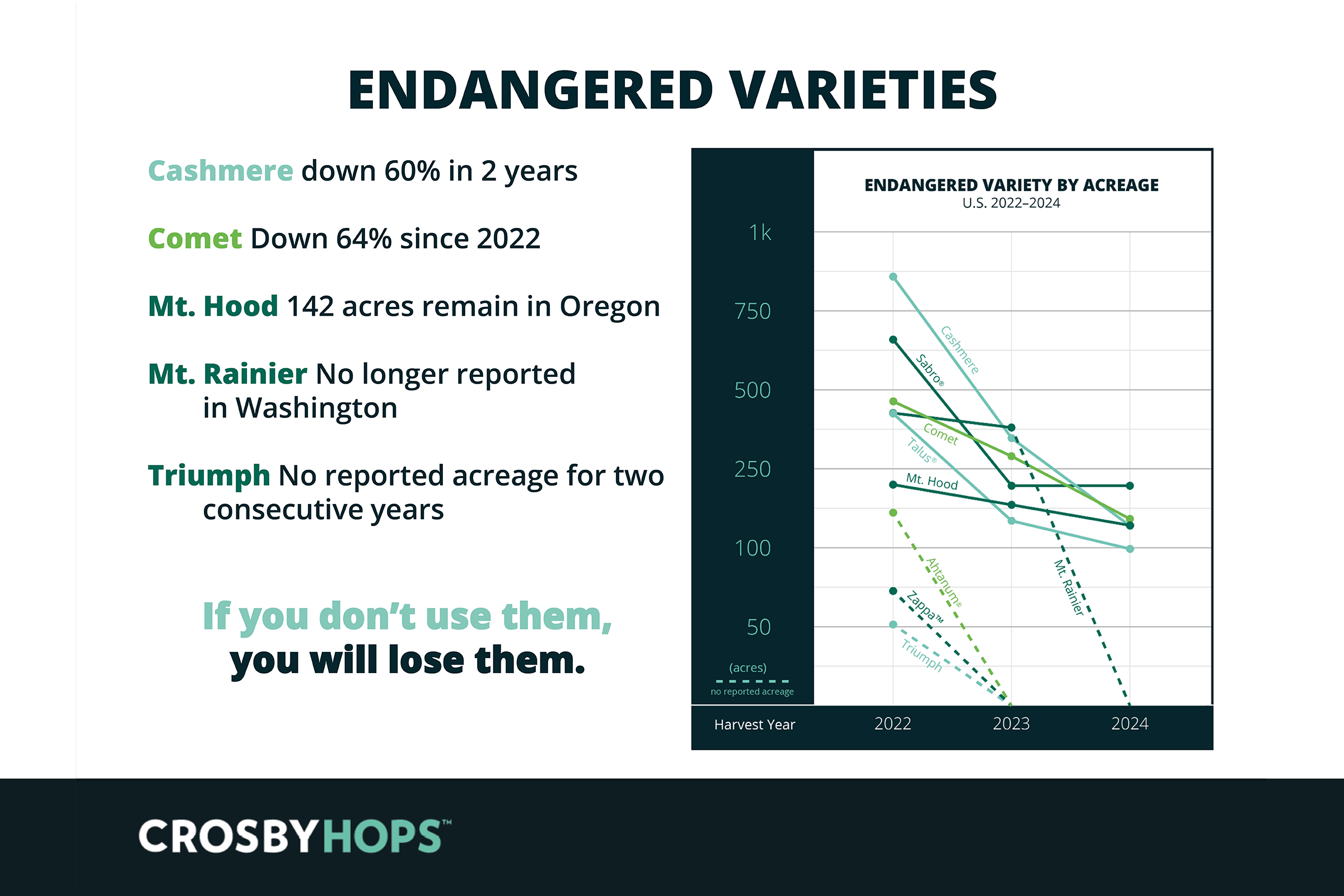 Lastly, we grouped varieties that have seen significant downward pressure to create an ‘Endangered List’ of public hop varieties. There’s some stark reading here – Cashmere is down 60% in the past two years, Comet down 64% since 2022, Mt. Hood has fallen to just 142 acres in Oregon, with Mt. Rainer no longer reported in Washington at all.