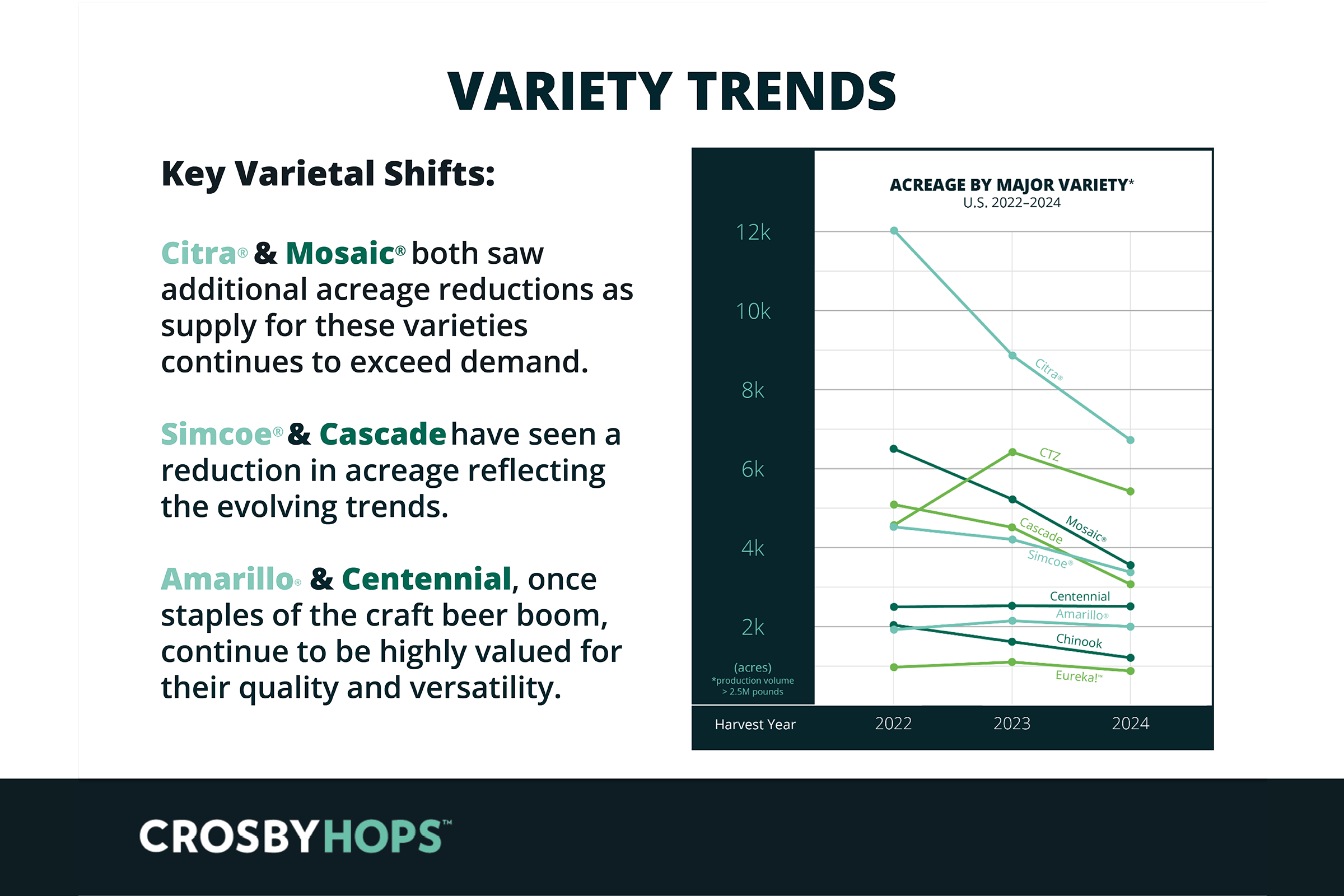 2024 USDA Hop Report shows data for specific US hop varieties strung, and at Crosby Hops we’ve taken a dive into this data to identify both general trends in the US hop industry, and public vs proprietary variety trends too.