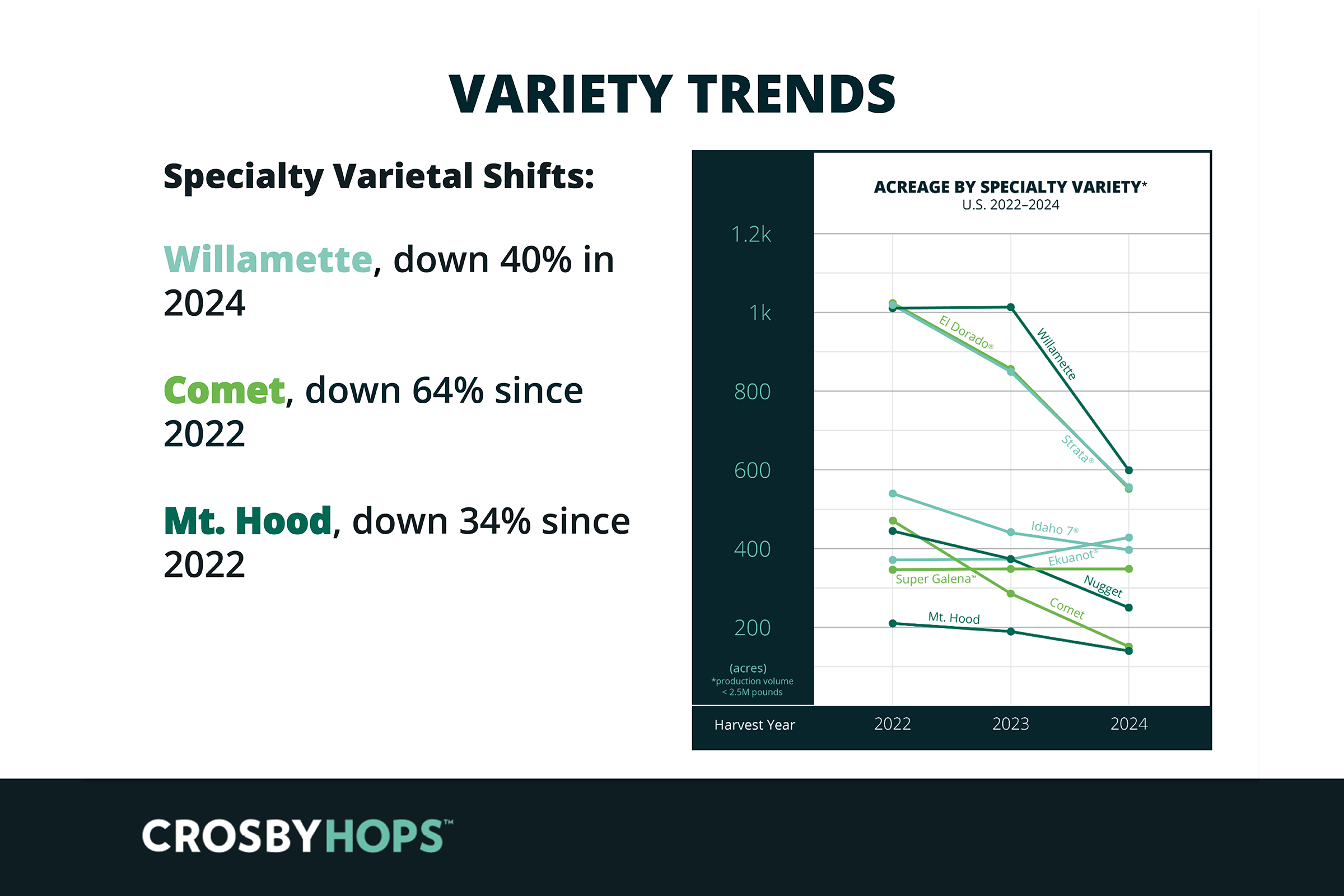 We define ‘Specialty’ hop varieties as those hops which cover an acreage of 1,200 acres (486 hectares), and we’ve seen a downward trend here too. Willamette acreage has dropped 40%, Comet down 64%, and Mt. Hood is down 34%.
